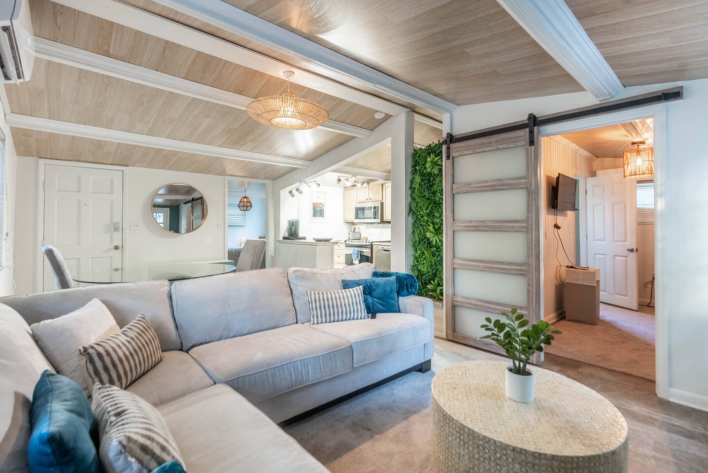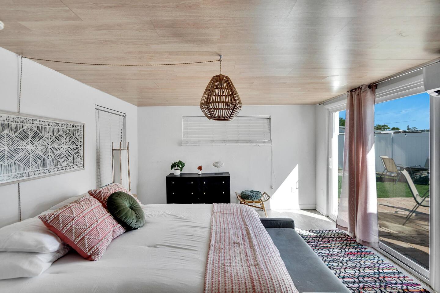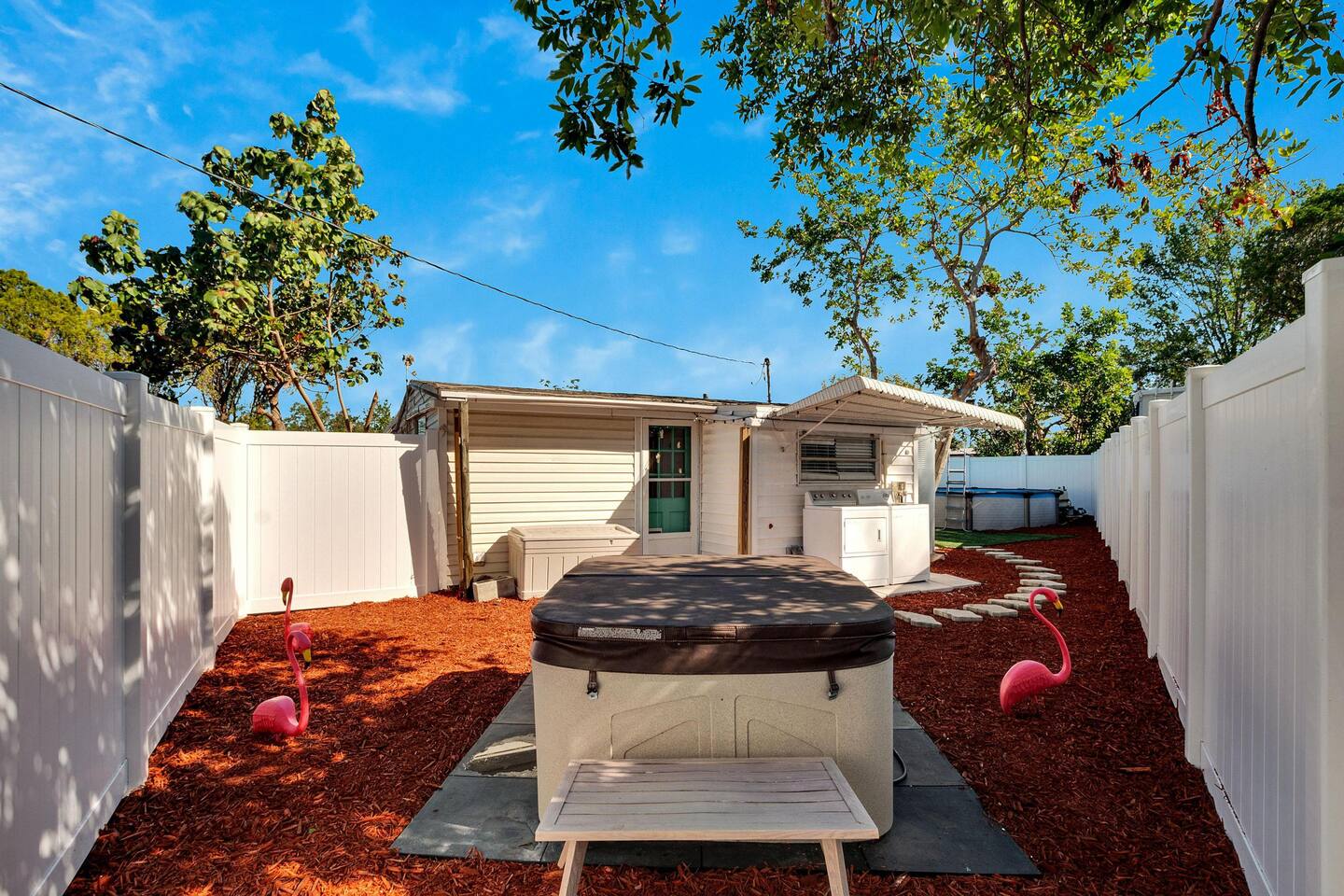 Your Oasis Retreat will include amenities such as: Private Pool, Hot Tub, Outdoor Bar, Outdoor furniture, Smart TV's, fully equipped kitchen, washer, dryer, and High Speed Internet. Your host has paid attention to every detail of this home to create a great guest experience. Your group will find ample space for dining, an indoor and outdoor dining table with seating for up to eight guests. The fully equipped kitchen includes, coffee maker, refrigerator, oven, stove, silverware, utensils and everything you’ll need to cook and prepare meals for your friends and family. The living room features a smart TV with your favorite streaming services available. A queen-sized bed in the master bedroom with private bathroom, desk, and Smart TV. A twin sized trundle bed in the second bedroom with private bathroom, desk, and smart TV. The relaxing outdoor area creates a Zen mood with its modern decor and nature environment. Your group can dine and relax with a tropical view in the privacy of this beautiful home. Bed Sizes: Bedroom #1 - Queen Sized Bed (Sleeps two) Bedroom #2 - Twin Sized Trundle Bed (Sleeps two) Living Room - Queen Sized Air Mattress (Sleeps two) Sleeper Sofa (Sleeps two)